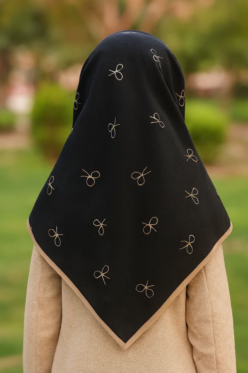 روسری نخی با کیفیت عالی در قواره های 90 و 110 با زمینه مشکی و پاپیون نسکافه ای